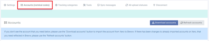 From the Accounts (nominal codes) tab, use the Download accounts button and choose the accounts that you'd like Breww to be able to use. Once the accounts have been downloaded, you can map your default sales and default bank accounts (in the Settings tab). If you wish for payments of different methods to go into different accounts in your accountancy provider you can set these in the settings here too. If you don't, just leave them blank.