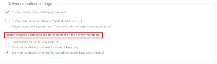 You can also choose to display BBE dates on your delivery manifests; you can do this in Settings->Delivery settings->Delivery label/document settings and amending the Delivery manifest settings for Display assigned containers and batch number on the delivery manifests to either "Show on the delivery manifest for casks & kegs only" or "Show on the delivery manifest for everything (casks, kegs and smallpack)" depending on your preference.
