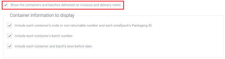 You can choose to include BBE dates, batch numbers, and container codes/packaging IDs on invoices by heading to Settings->Order/invoice settings. Here, there is a checkbox option to Show the containers and batches delivered on invoices and delivery notes. by selecting this, further checkbox settings options will be presented.