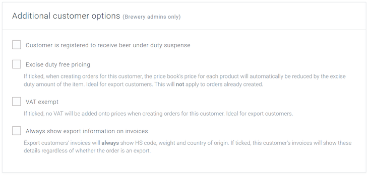 There are four additional customer options in Breww that are only visible to admin users. These options need careful consideration before being used, as they can have implications for how Breww calculates your beer duty, invoicing information and pricing.