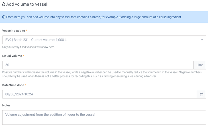 If the vessel volume has decreased through racking or transfers, or there have been losses when completing a racking or a transfer, then this feature should not be used; the dedicated racking and transfers features should be used instead. However, you may have a scenario where the volume in the vessel has decreased for other reasons; for example, you may have used some of the beer from the vessel for QA purposes. You may also need to rectify a mistake where the initial transfer volume has been transferred incorrectly. You will be able to reduce the volume in vessel by simply entering a negative number in the Liquid volume field. If you would rather correct the initial transfer volume, then you will be able to do this by following the Undo/correct batch errors help guide.