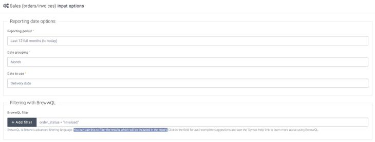 As with the aggregate report builder, you can use BrewwQLto filter what results will show in your report. You can then save the report for easy future access. Once that's been done the report will be listed (with your chosen name) in the "Reporting" section of Breww.