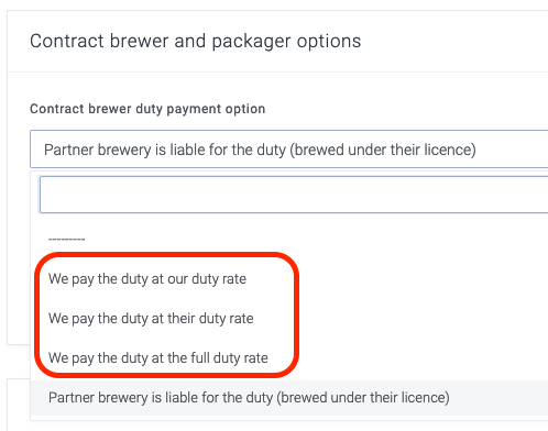 - Any batches that have been contract-brewed for you where you've chosen that you pay the duty (all the "We pay..." options in the screenshot below).