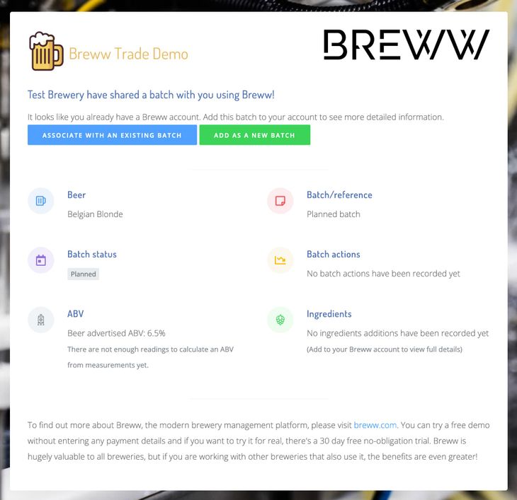 Anyone with this link will be able to see basic information relating to the batch. They don’t need to be logged in, or be a Breww customer (so don’t give the link to people you don’t want to see this):