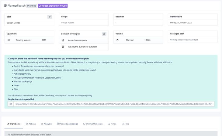 The contract brewer that’s brewing the beer can share the batch details by simply sending you the secure link shown on the batch. For this side of the 'share', nothing else is different to any other batch, other than you will see details on how to share the batch link: