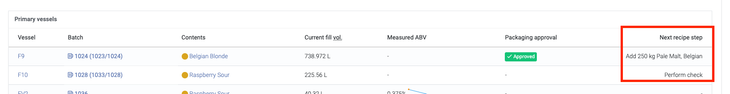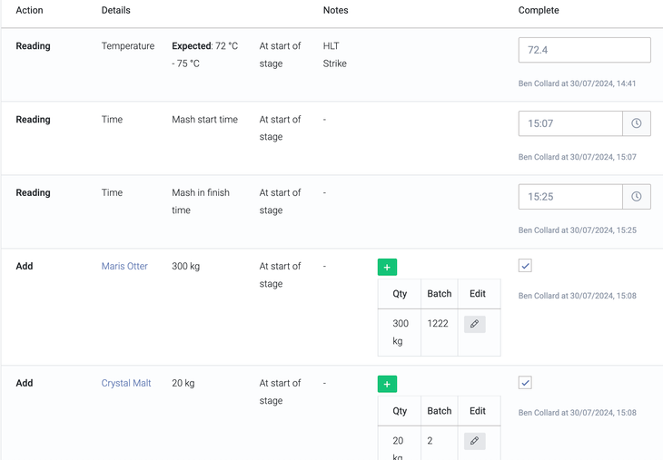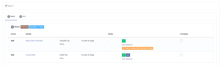 You can mark each action as 'complete'; this may be after adding exactly what the recipe calls for, more, less, or even nothing at all. It's simply to confirm that you've moved on from this action and that it is complete. Ticking the 'complete' box itself has no direct impact on stock levels. If you do not make an addition and mark that action as complete, a notice will pop up to tell you this has been “Marked as complete without using any stock”; you can ignore this if this was the intention.