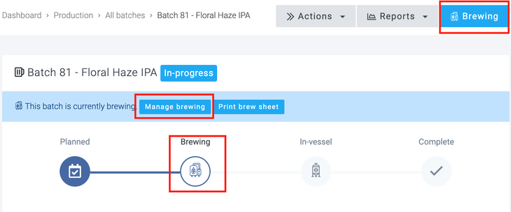 Once a batch has been started, it will move from the status of 'Planned' to 'Brewing', and will be given a tag of In-progress. You will now be able to use your electronic brew sheet by selecting one of the three highlighted buttons.