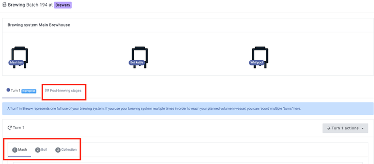 Your brew sheet will reflect the brewing stages included in your recipe and the type of stages that these are. In this example, the main 'brewing' stages are listed under 'Turn 1', and we simply have Mash, Boil, and Collection. By selecting Post-brewing stages, you will see stages such as 'Fermentation' and 'Cellaring'.