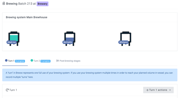You can visually reflect your brewing system vessel movements on your brew sheet to help track your progress. You can transfer from vessel to vessel by using the -> Turn 1 actions button. This example shows two separate turns in my brewing system at the same time, with Turn 1 currently in the boiling stage, and Turn two in the mashing stage.