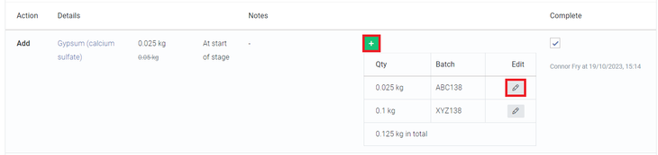 The edit button will allow you to edit the quantity of that ingredient or stock items added from that batch. (To remove a batch addition completely, you can simply set the quantity to 0.) If you want to add the same ingredient addition but a different batch, setting the quantity to 0 first will allow you to re-add the addition with the correct batch.