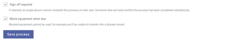 You can then give the process a name, a process 'type' and process instructions. There are also two checkboxes: one that enables the process to require a sign-off from another Breww user to ensure work is getting double-checked and an option to block equipment from being used if a process has not been completed.