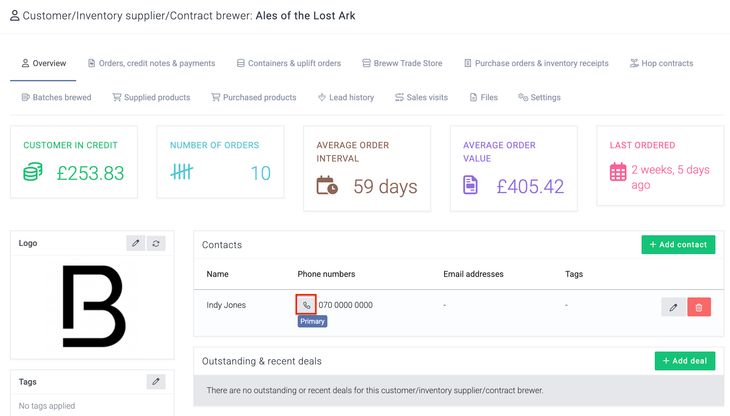 In various places throughout Breww, you'll notice a small phone button next to phone numbers. This button triggers a click-to-call function designed to make it quicker and easier to initiate phone calls directly from Breww.