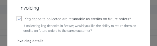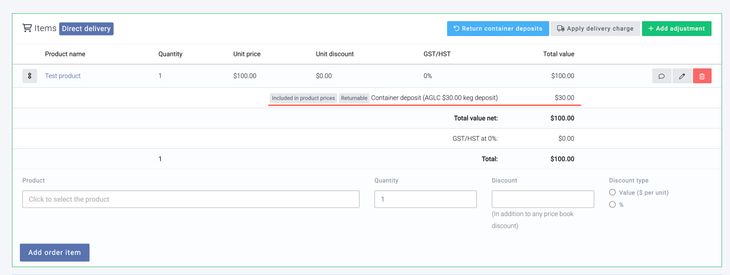 Keg deposits are set on the AGLC/Connect integration dashboard by clicking the "Set keg deposit amounts" button. This will automatically create a Breww-managed container deposit scheme for you. Don't be tempted to add your own scheme; due to the keg deposit amount being integral to the wholesale price calculations, this must be managed by Breww. All you need to do is add the deposit amounts per product. Then, when a product is added to an order, you'll notice a line showing the deposits collected. The invoice PDF will also show the value of deposits collected.