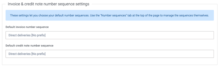 Then, set your defaults for both invoices and credit notes to the Direct deliveries number sequence: