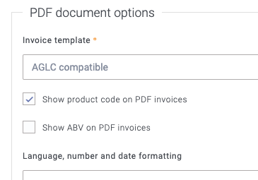 Invoices can be completely customised in Breww. As there are strict rules dictating how invoices should be laid out, we have created a dedicated invoice PDF template for use with Alberta orders. The normal "Breww Modern" invoice template will be used by default for all other orders. The way in which you can specify which invoice template will be used by each customer is to set up Invoicing details . You should set up new invoicing details for use with Alberta orders and assign the "AGLC compatible" PDF template to be used by all customers using these invoicing details. You should also tick the box to show product codes. It is strongly advised you set all this up before importing your customers/licensees, as it means these details can be automatically applied to the customers on import.