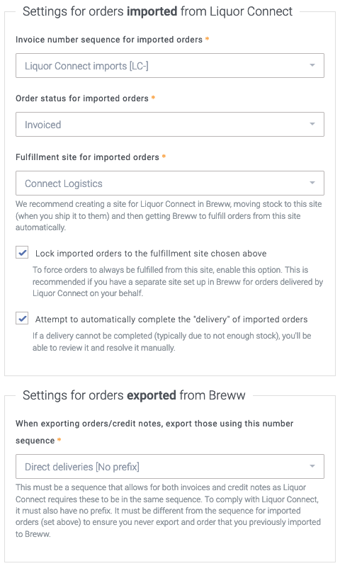 The plan is for orders fulfilled by Liquor Connect on your behalf to be imported to Breww using the Connect Logistics imports sequence and as such all numbers will be prefixed with LC-. Orders delivered directly to the customer by you will use the sequence with no prefix. This should also be shared with invoices and credit notes. This ensures that when you export these for the AGLC upload file, they will always be suitable numbers for AGLC to process (and fit with their restrictions/limitations).