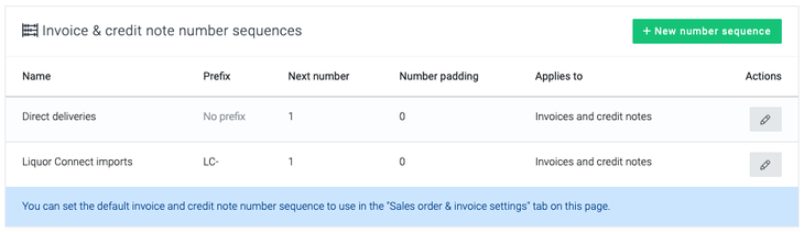 For the "Direct deliveries" sequence (with no prefix), you should make sure to set the Next number to the next invoice number that you'd like to use to ensure you don't re-use a number that has already been submitted to Liquor Connect in the past.