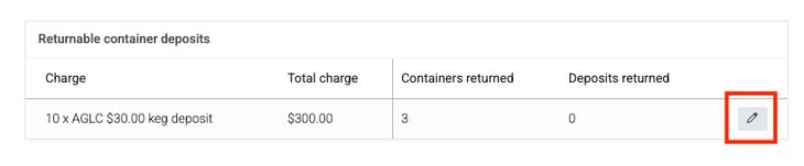 Once the container is returned, the deposit can be credited to future invoices for the same customer. Returning a container can be done a few ways in Breww. If you use tracked containers, all you'll need to do is scan the container back in as normal using the Breww mobile app, or go to the tracked container's page and click Actions -> Return container. If you don't use tracked containers, you'll need to tell Breww that a deposited container has been returned. To do this, go to the order where the deposit was taken, and edit the number of containers returned using the button in the screenshot below. If a product has been returned, e.g. damaged or unwanted, the credit will be available automatically when the product is returned. If credits are available when placing an order, you'll see a blue button on the order page, which you can see in the screenshot above the previous paragraph. Deposits returned as credits will show on your Direct delivery export.