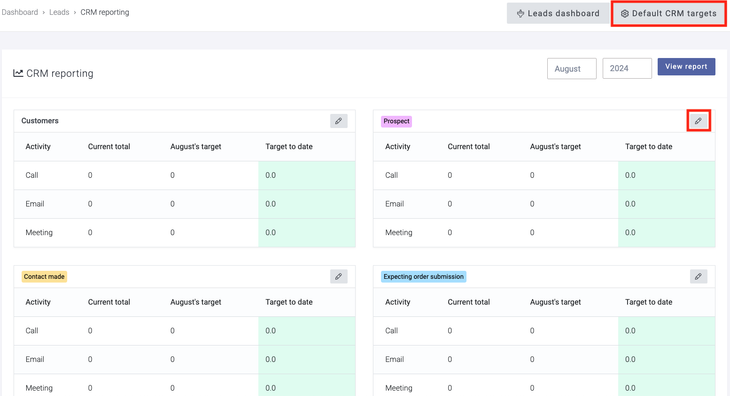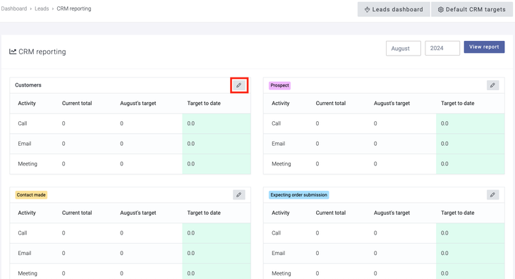 To set your default targets, select the Default CRM targets button. You can enter any overrides for the month via the edit pencil against the lead status.