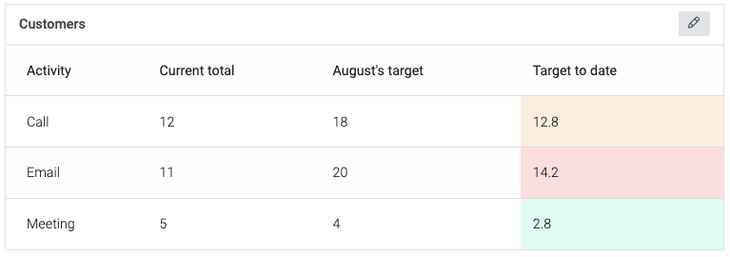 As you enter CRM activities, the report will update to include these entries. This will display the Current total alongside the target for the month and the Target to date. 'The target to date' figure is based on the day of the month that you look at the report, and this will display the expected activity to have taken place. In the example below, the Target to date for 'Call' activity to customers is 12.8. This is simply looking at your target (18) divided by the number of days in the month (31) multiplied by the number of days in the month so far (22). If you are on target, then this field will be displayed in orange. If you are not on target for the month, it will display in red; if you achieved your target, it will be in green.
