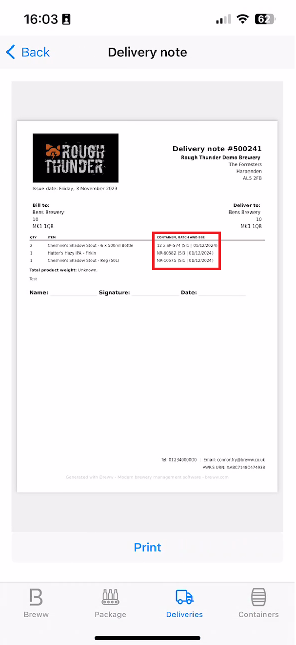 We are also planet-conscious here at Breww, so you can also use the same settings as in the linked article above to add this information to your delivery notes, which you can access on the Breww app by going to the deliveries section, selecting your delivery day and fulfilment site, managing the run and using the View PDF/on web button to view your delivery note PDF.