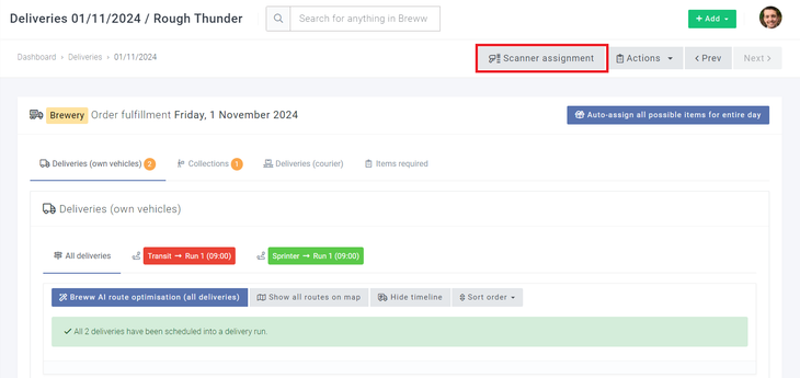 If you navigate to Deliveries and select your delivery day and fulfilment site, then you will have the option to assign stock using a connected scanner to your delivery day by selecting Scanner assignment