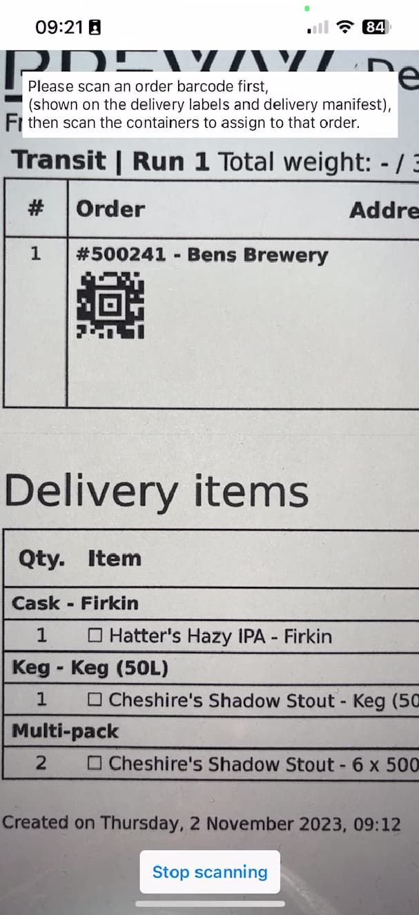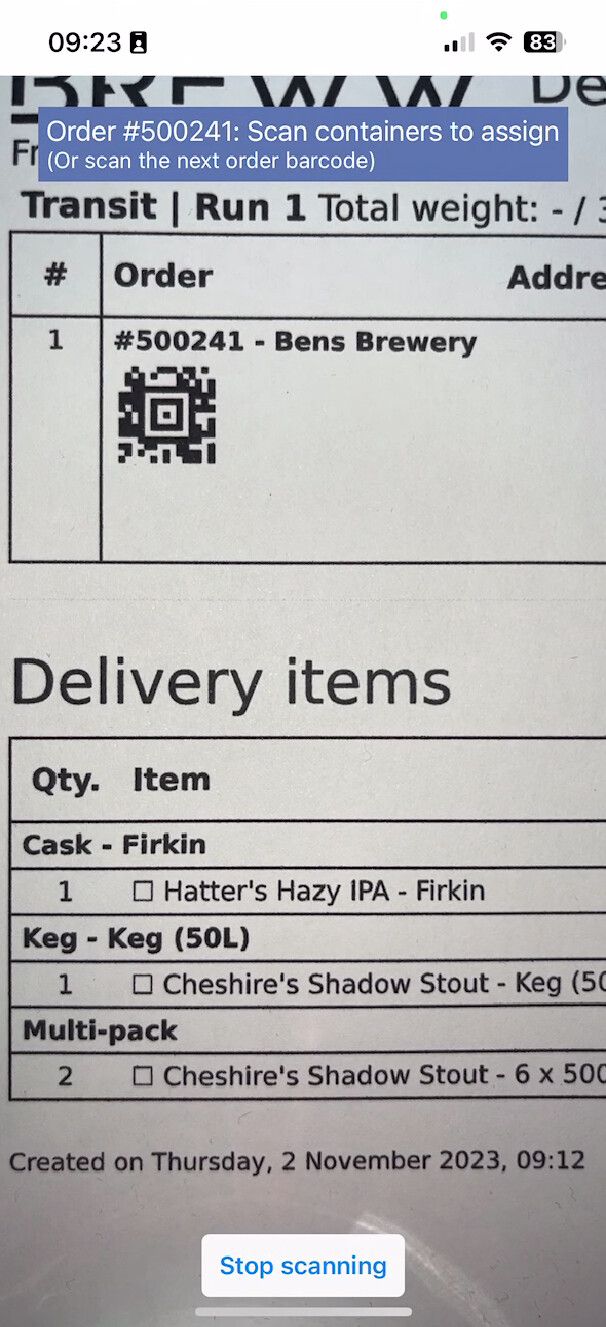 To use this method, you need to first either print your delivery manifests or delivery labels. Once you have these, you need to navigate to the deliveries section of the Breww app, select your delivery day for your fulfilment site, and then select assign containers. This will then ask you to scan the order barcode from your delivery manifest or delivery label, and once scanned, you will then be prompted to scan your containers to assign for that order.