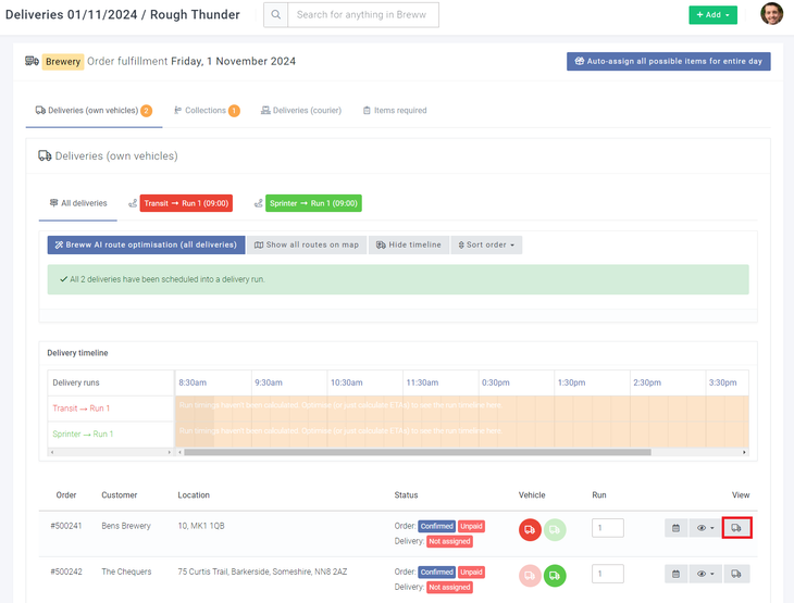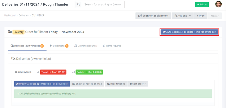 Once you have configured auto-assign to work as you want, it is very easy to use and present in several places throughout the deliveries section of Breww.