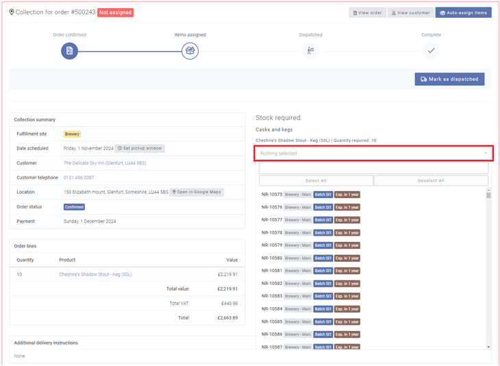 Once you have opened the fulfilment page for a specific order, you can assign specific containers and batches to deliveries using a dropdown.