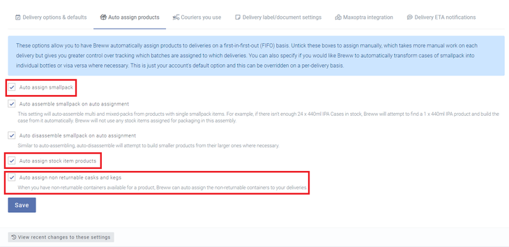 The auto-assign functionality is actually controlled in Settings → Delivery settings → Auto-assign products. Here, you can decide exactly what is auto-assigned and what Breww can and cannot do to auto-assign stock.