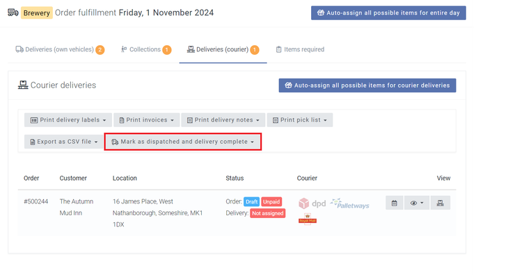 Couriers has a unique function to mark as dispatched and delivery complete, which allows you to choose individual couriers or all couriers, but doing so if you have not manually assigned stock will trigger Breww to auto-assign all possible items, dispatch and complete those courier orders.
