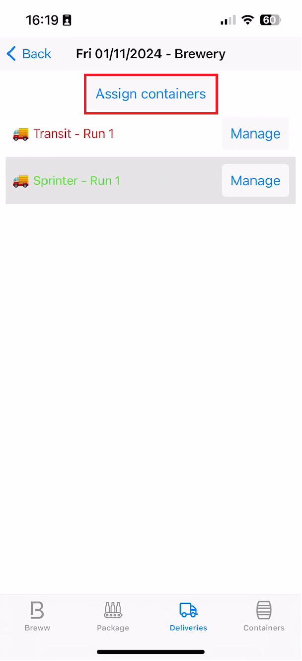 Assign containers to specific orders by delivery method and run on a given delivery day in the Breww app
