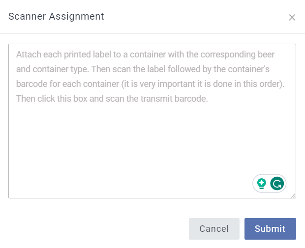 Once you have selected scanner assignment, a window will open, and this will prompt you to apply your delivery labels, scan them, and then scan the container code or stock label. This must be done in this order throughout scanning, but you can scan as many delivery labels and containers in sequence until you have assigned all stock.