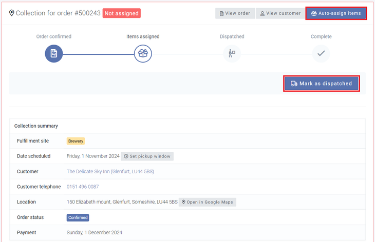 The last place where auto-assign can be used is on an individual orders fulfilment page. This can be done by either marking the order as dispatched, which will auto-assign anything outstanding possible based on your auto-assign options and dispatch the delivery. You will also find the auto-assign items button at the top of the page.