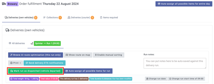 If you first head to Deliveries and select the delivery day date. Provided that the **Deliveries (own vehicle) **deliveries for the day have been optimised onto a delivery run, you will be able to select the delivery run, followed by the Mark run as dispatched (vehicle departed) button. Selecting this will mean that any required stock is auto-assigned (if enabled), and the assigned stock crosses the duty threshold; a duty entry will also be made. It is worth noting that the order must be 'Confirmed'.
