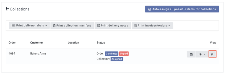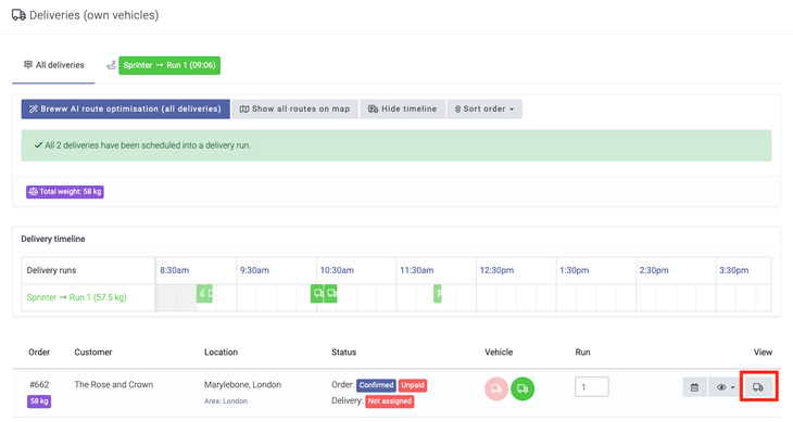 Deliveriesand select the delivery day date. You will then be able to select the delivery method that the order is scheduled on and to view the delivery by selecting the button highlighted in the screenshot below (the button icon will vary depending on the delivery method).