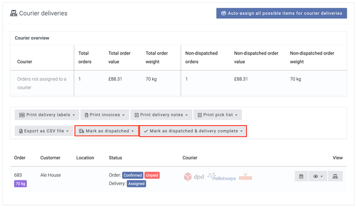 On a delivery day, you will be able to select the Deliveries (Courier) tab to view your courier deliveries. From this page, you will be able to choose to either Mark as dispatched or Mark as dispatched & delivery complete, depending on how you would like to handle your courier deliveries. If you have selected a specific courier company for your courier deliveries, then you will also be able to choose to dispatch the deliveries for the specific courier company or all courier deliveries when selecting these buttons.