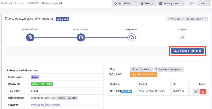 It is important that your orders are marked as 'Dispatched' in Breww when your stock/delivery vehicle leaves the premises. This ensures that your stock levels are reduced accurately and that duty has been appropriately accounted for.
