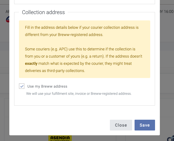 As in the screenshot below, in the Couriers section of Breww, you can override your Breww collection address to exactly match the one entered without your courier. All spaces must match, and it is case-sensitive.
