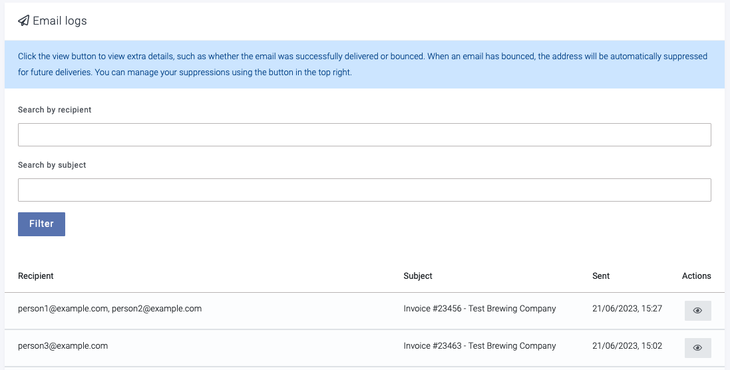If you have a customer/supplier who is questioning if an email has been sent to them, you can check Breww's email logs.