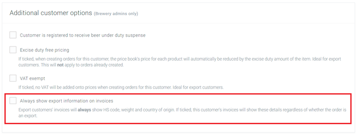 However, there may be occasions where you would like these details included when the delivery address on the order is in the same country. You can choose to Always show export information on invoices for a specific customer by heading to the customer, selecting Edit, scrolling down to Additional customer options (this option is only visible to Breww admins), checking the checkbox for this and then clicking Save.