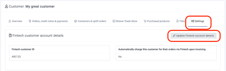 You can manage the Fintech customer account number for any Breww customer by visiting the customer's page in Breww and using the "Settings" tab.