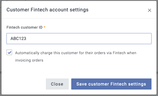 Once the integration has been set up, you'll be able to add a "Fintech customer account ID" to any applicable customer accounts. This will ensure that the correct Fintech customer account is billed. You'll also be able to choose for these customers whether you'd like payments to be automatically sent to Fintech for you or not. Any customers without a "Fintech customer account number" set will be completely ignored by the integration, and you can continue to process their payments outside of Fintech.