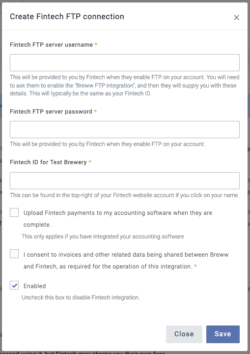 First, contact your Fintech account manager and ask them to enable FTP access on your account for integration with Breww. They should also ensure that payment confirmation files are sent to Breww via the FTP server.