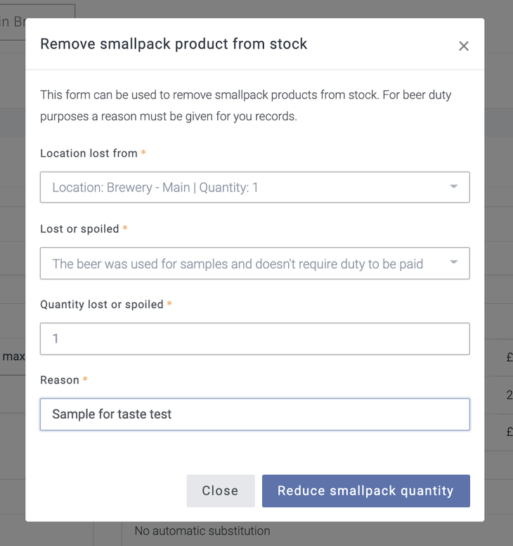 To enter a sample into Breww where the sample isn’t liable for duty, start by going to the product you want to enter a sample for, click Actions (in the top right) -> Stock adjustment -> Reduce stock. Fill in the correct details for your sample, like in the screenshot below.