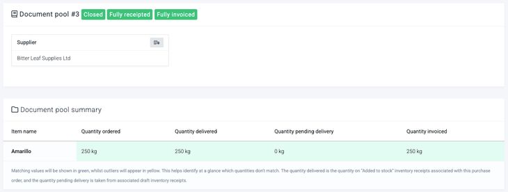 Once your supplier fulfils the outstanding quantity, the document pool will automatically close, and the summary will update to show that all stock item quantities have been reconciled. The document pool here has made it easy to track the quantities across multiple documents, with our single purchase order fulfilled by two inventory receipts but invoiced by a single supplier invoice.
