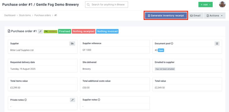 To add a new inventory receipt to an existing document pool, you simply need to associate it with a purchase order. You can do this by either selecting Generate inventory receipt from an existing finalised purchase order: