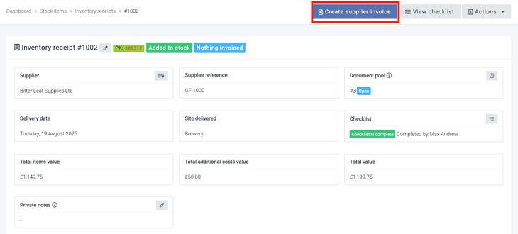 Supplier invoices are created by selecting Create supplier invoice on an inventory receipt and are automatically added to the same document pool.