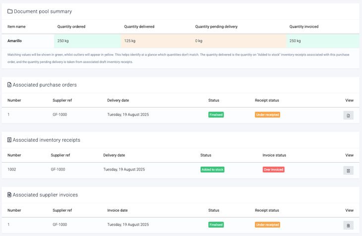 Goods in document pools are the grouping of related purchase orders, inventory receipts, and supplier invoices. They give you a single, simple view of what was ordered, what was received, and what was invoiced, regardless of how many partial deliveries or split invoices a supplier used to fulfil the order.