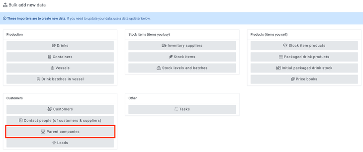 Before importing your customers into Breww, we recommend creating your parent companies. Parent companies can be used as a 'group account' to group multiple individual customers (e.g. pubs) under a single billing entity (a parent company for the pubs). You can either enter these manually by heading to Customers->View-> Parent companies, or, if you have a larger number of parent companies, you will be able to do this by heading to Settings->Data import and updates->Parent Companies.